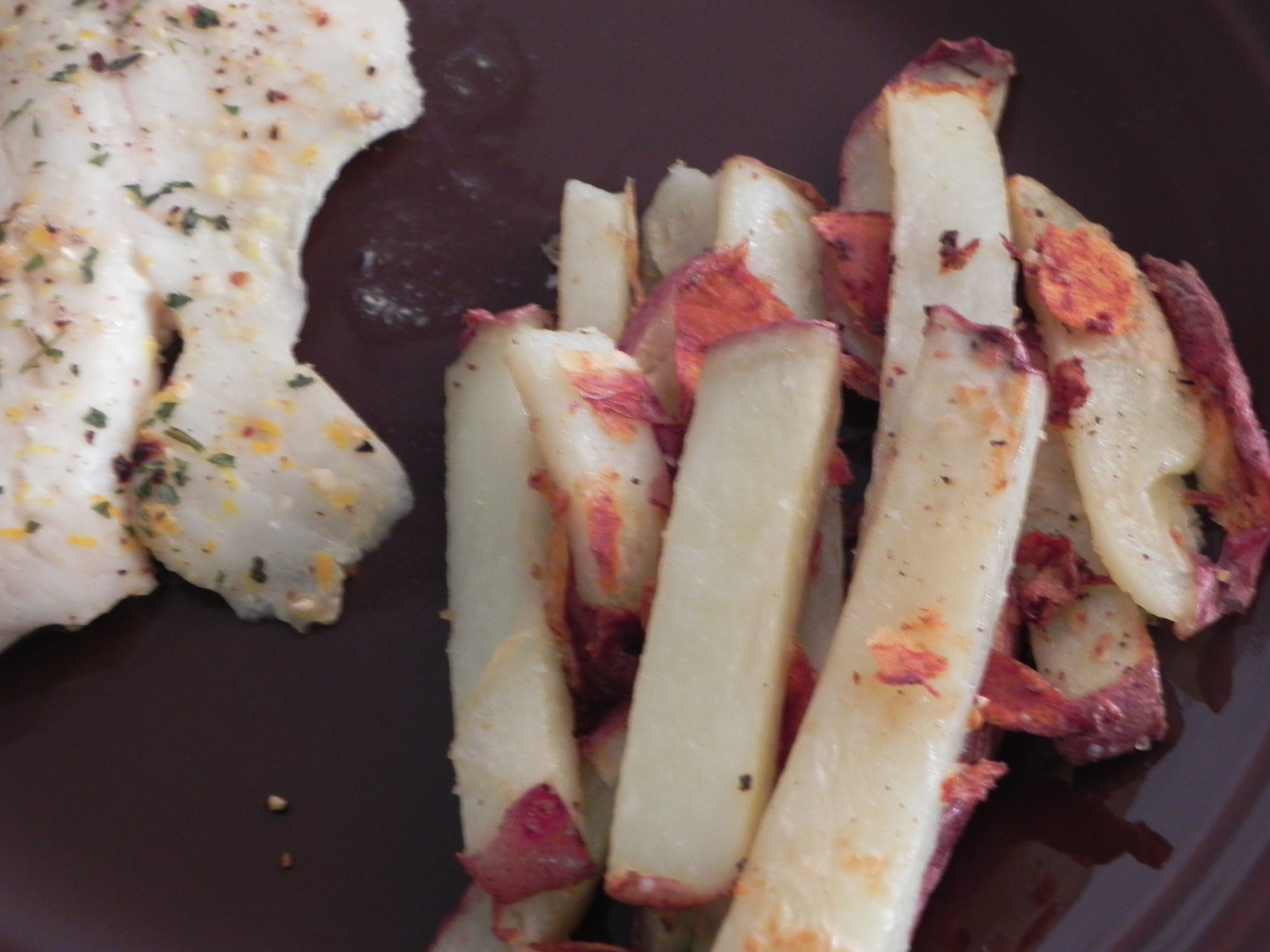 Directions: Preheat oven to 425 degrees. Line baking dish with foil and cover lightly with cooking spray (you don’t have to use foil, but if you don’t definitely use cooking spray or grease the pan in some way). Place filets in baking dish. In small bowl combine lime juice, lemon pepper, and orange zest to make marinade. Brush the marinade onto the filets, coating evenly. I used the entirety of my marinade, but as long as they’re all well covered that’s what matters. Sprinkle lemon pepper and dried cilantro to taste on top of filets. Bake in oven for 9-11 minutes or until fish flakes easily. Serve with your choice of sides. I made a tasty salad and homemade fries! Eat until full, take a break, come back, and eat some more. Yum.