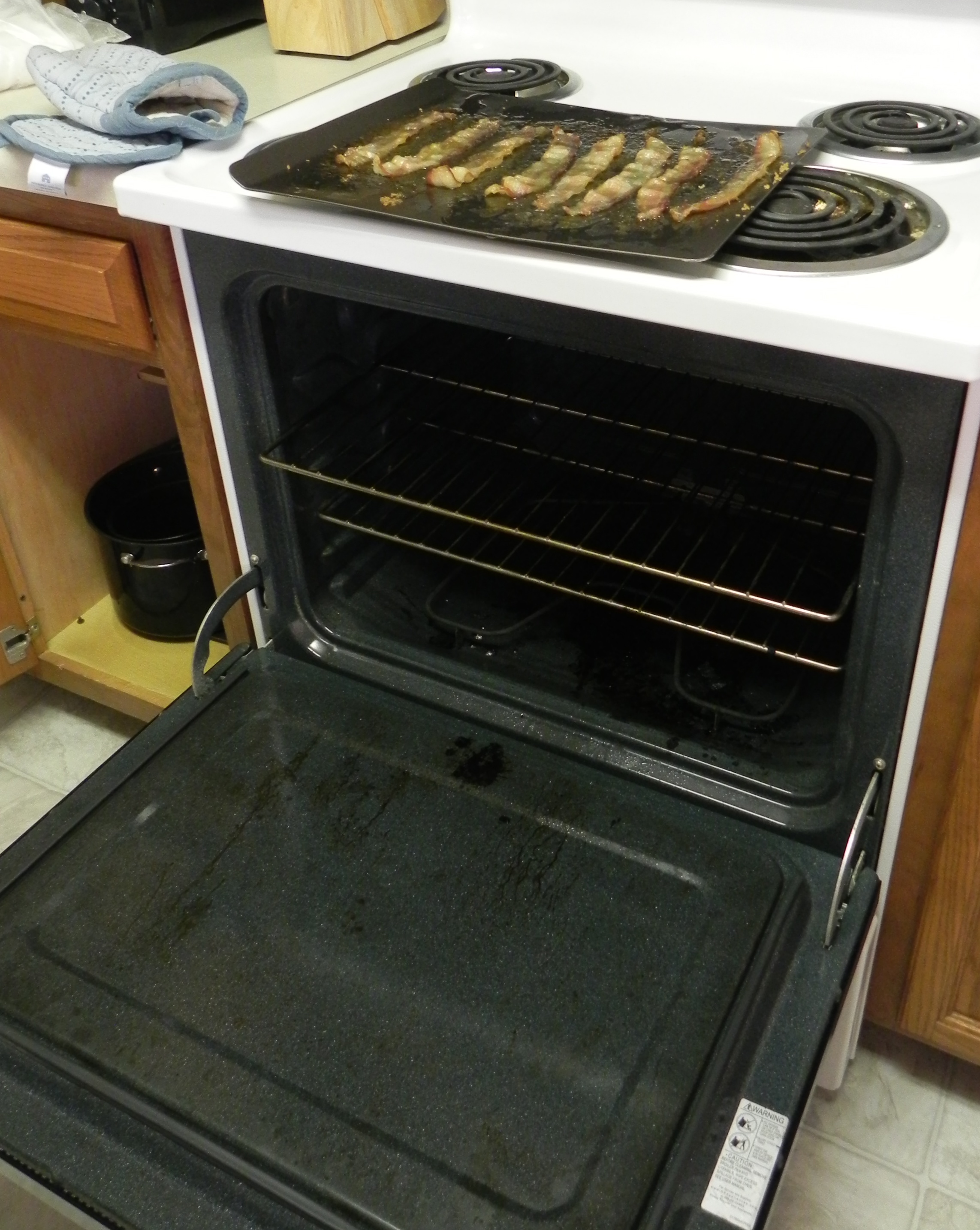 …grease spills all over the inside of your oven [hardly any of that mess was there before]. Smoke billows across your entire apartment. The fire alarm goes off. The cat runs to the spare bedroom in fear and hides under the bed. The husband turns off the fire alarm. The back door is propped open. You eat a piece of bacon. All is okay in the world.
