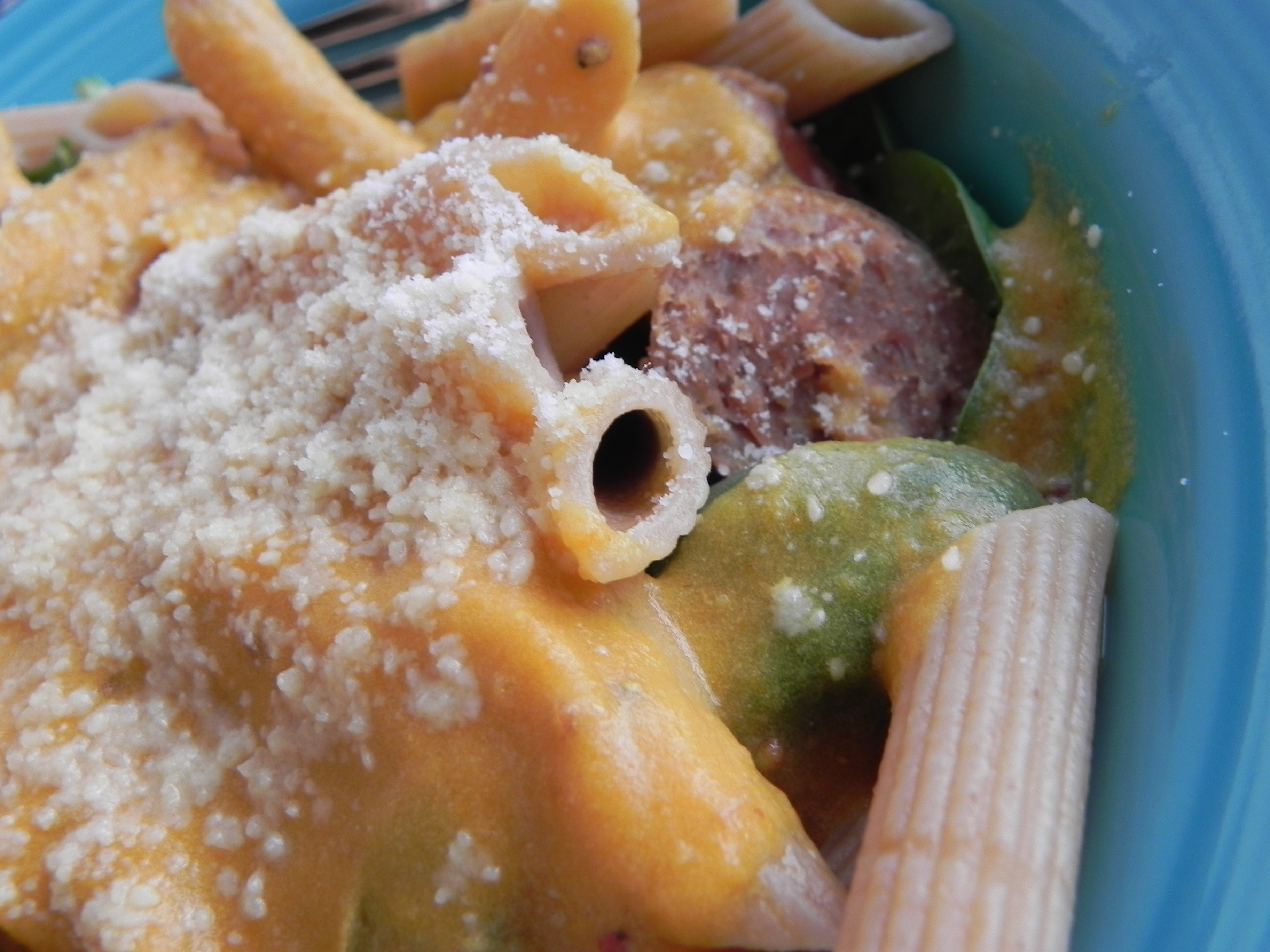 This Pumpkin Pasta Sauce is one of the tastiest nontraditional pasta toppings I’ve had of late. It is creamy, tangy, and light, while still being rich in flavor and high in taste. The pumpkin adds a savory depth of flavor, while the dijon mustard and sage add tang and spice to the mix. Served atop a bed of baby spinach, whole wheat penne, and a chopped turkey Italian sausage, this is a great, filling meal for any pumpkin lover. If there are any apathetic pumpkin-eaters at your table, then that’s okay… more for you; more for me! 🙂