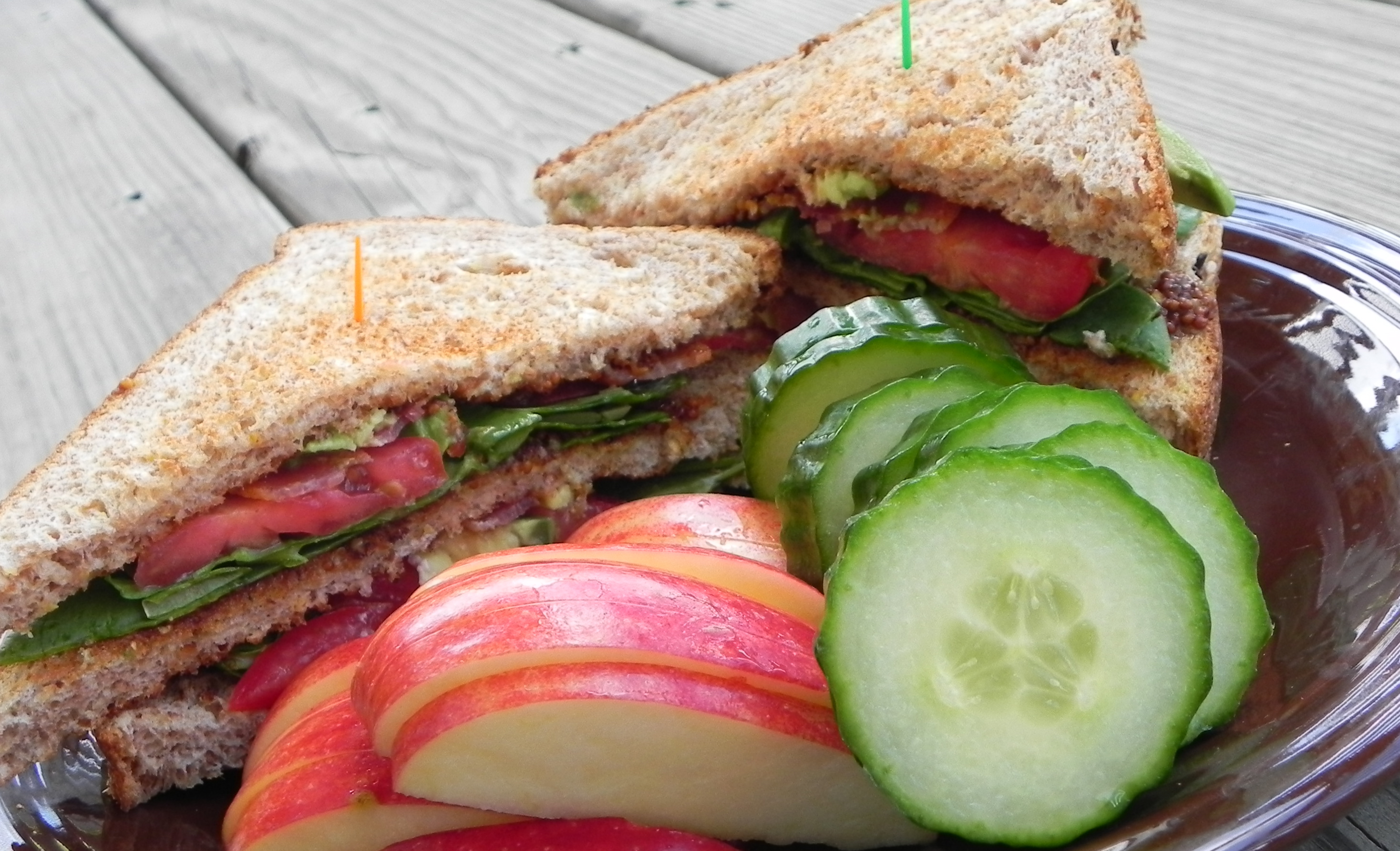 In a small bowl, mix together mayonnaise, mustard, and honey. Spread mixture on one side of each piece of bread. [I had some leftover.] Then layer spinach, tomatoes, bacon, and avocado on one piece of bread. Top with a second slice and repeat. Top with final slice of bread, then press down, pierce sandwich with toothpicks, and cut into two slices… diagonal is best. 🙂 Enjoy!