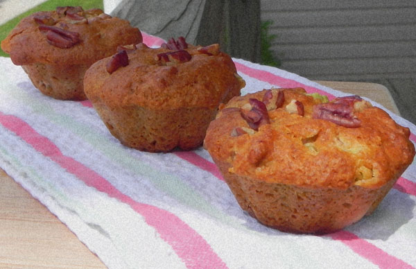 Spoon mixture into prepared pans, approximately 2/3 of the way full. Top with pecans and then bake for 25-30 minutes, or until golden brown.