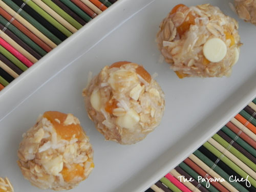 So, as you guys know, I’ve been furiously writing away on my thesis for the past few weeks. I worked on it before, but I took a break from my campus jobs to really focus. That helped… but you wanna know what really helped? These awesome, tropical little bites of energy! Enjoying a treat full of coconut, apricot, mango, and white chocolate makes the tedious just a lil bit better!