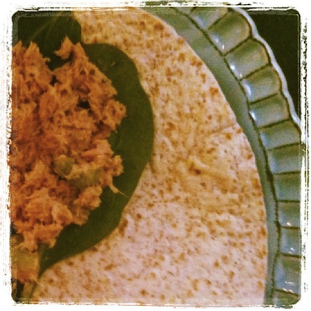 - Layer spinach on top of each tortilla, then top each with half of the tuna salad.