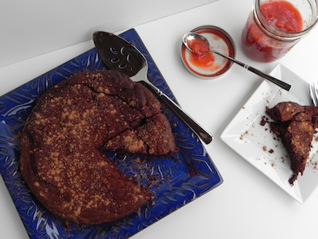 Flourless Chocolate Cake with Strawberry Sauce.