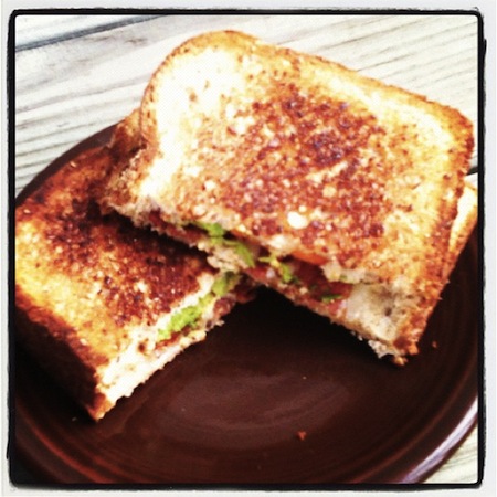 So my inspiration for this quick Wednesday lunch was derived from all those fancy grilled cheeses and quesadillas and stuff that I’ve seen on Pinterest [follow me!] but never think to make. I didn’t want to take the time to look up recipes… so I just improvised. To make my Extraordinary Grilled Cheese, I paired flavorful white cheddar cheese with creamy avocado, crisp bacon, and sweet bell pepper strips and grilled it up on the stove real fast. A filling, fun lunchtime entree to brighten up a dreary day of graduate schoolwork. Works for me!