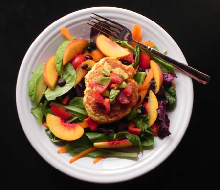 Lastly, make salad. In a large bowl, toss together mixed baby greens, sliced peaches, shaved carrot, chopped tomatoes, and diced pepper. Squeeze lime juice over salad and toss again. Serve corn cake over salad, relish over corn cake, and enjoy!