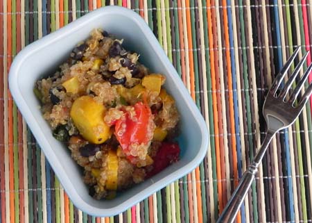 When quinoa and vegetables are ready, gently combine in a large bowl. Fold in black beans, red chili flakes, and basil. Serve immediately or chill for a cold lunch salad.