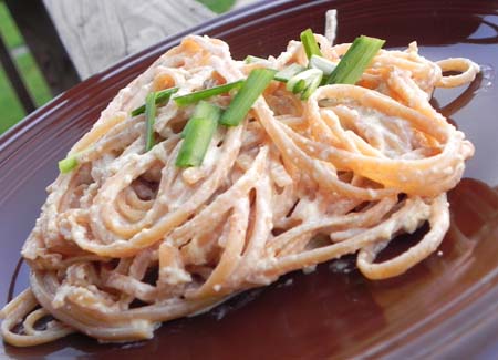 Drain the pasta and add it to the sauce mixture along with the pepper. Stir together and cook on low until the sauce coats the pasta, approximately 3 more minutes. Serve topped with fresh chives, and extra cheese if desired.