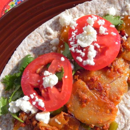 When I came home from campus the very next day, I pulled out my trusty Rick Bayless cookbook, Mexican Everyday, found an innocent looking recipe, and got to work. With the exception of yelling for help when it came time to cut the casing off of the chorizo, preparation of these Chorizo and Potato Tacos was a cinch! Twenty minutes later, plate on the table and fork in hand, I closed my eyes, said a prayer, and dug in, expecting the worst.
